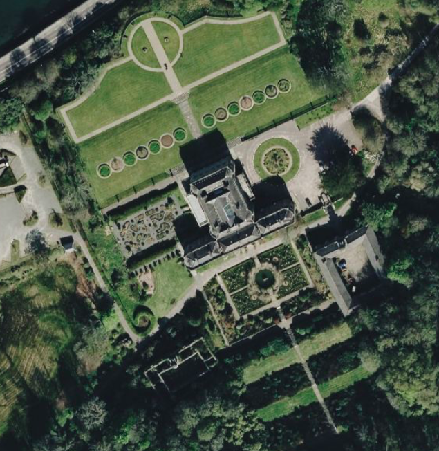 Bantry House from above with the three black squares visually dominating the scene. They are the shadows of the two servants’ quarters and the larger main house. The extensive formal Italian gardens can be seen on all sides.