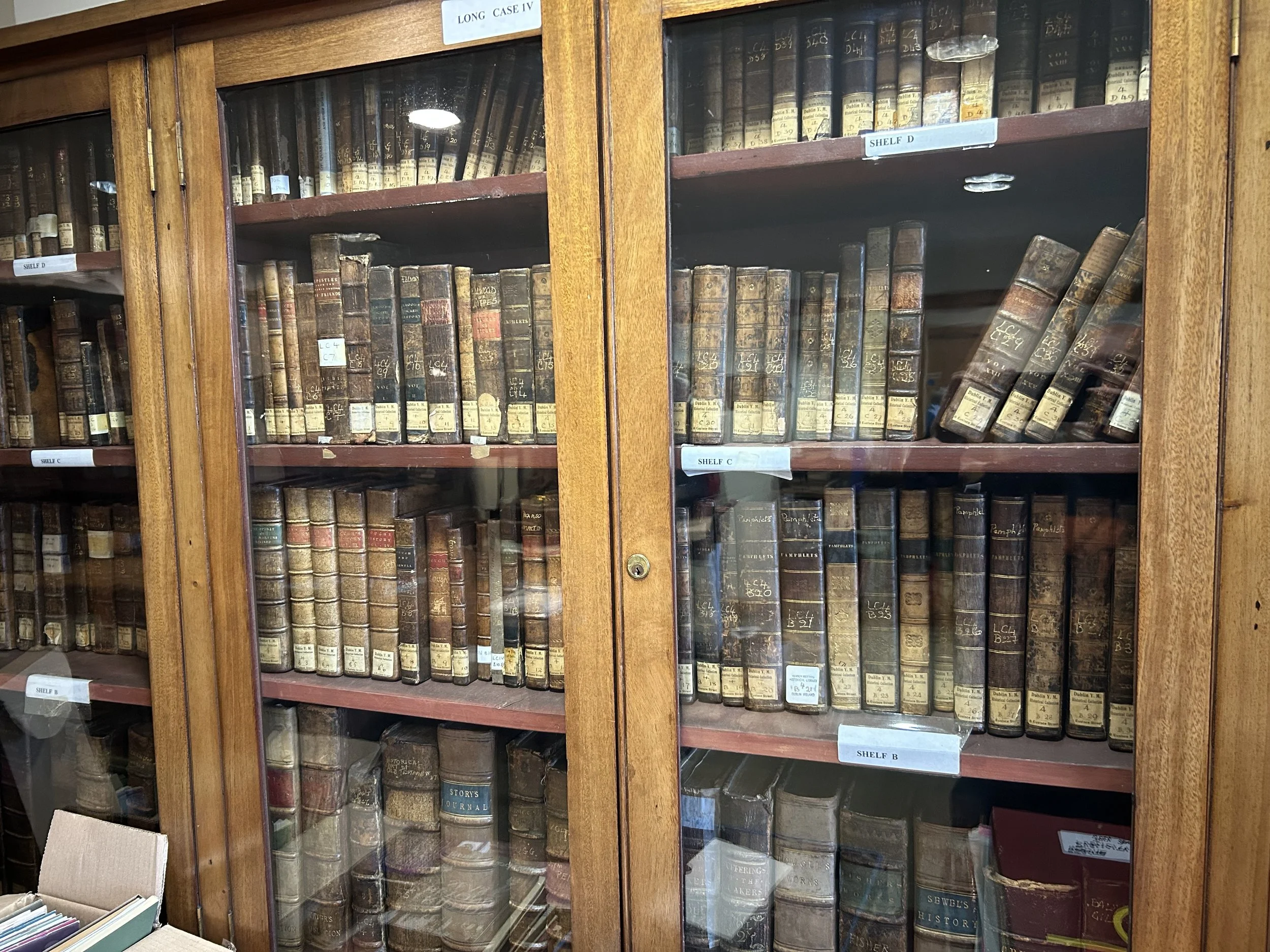 Some of the many shelves of old books and document collections in the Quaker Archive.