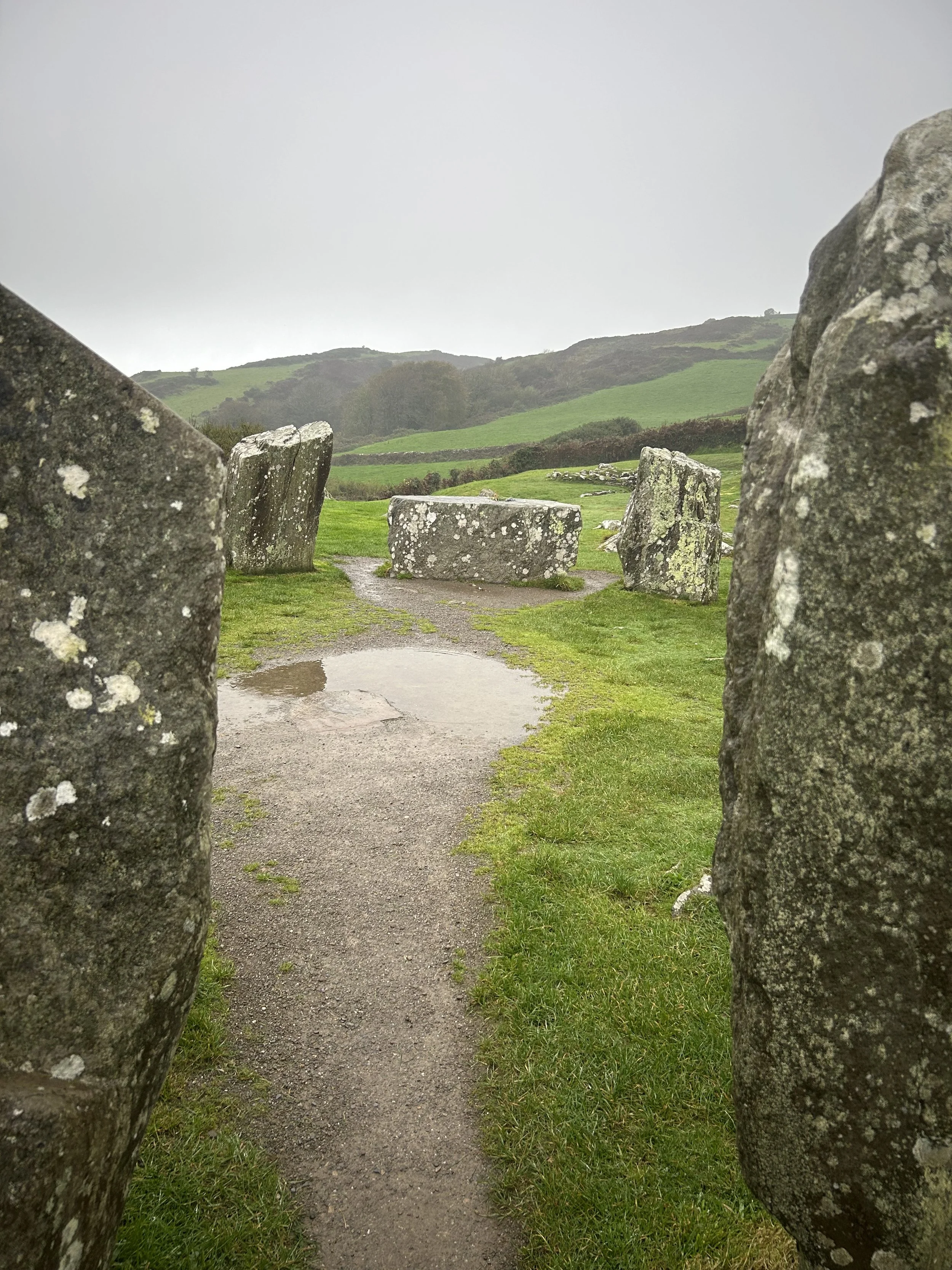 My own shot on a rainy October day looking through the portal stones toward the recumbent stone (or possible altar) at the far side of the circle. On December 21 the setting sun would be directly over its center. When it was excavated about 70 years ago a pot was found buried in the center of the circle. It contained the remains of a cremated young adolescent wrapped in a thick cloth.